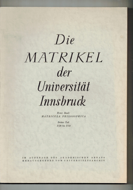 Erster Band: Matricula philosphica. Dritter Teil: 1736-1754. Hrsg. vom Universitätsarchiv. Bearb. von Anton Haidacher.
