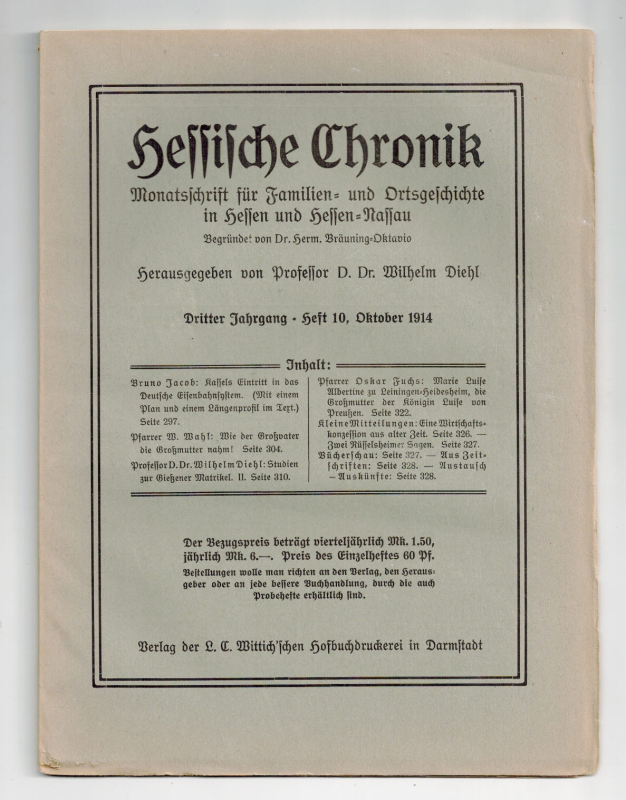 * Abhandlungen: "Kassels Eintritt in das Deutsche Eisenbahnsystem" (Bruno Jacob, S. 297-304, mit 1 Karte und 1 Längenprofil), "Wie der Großvater die Großmutter nahm!" (W. Wahl, S. 304-310), "Studien zur Gießener Matrikel. II." (Wilhelm Diehl, S. 310-322), "Marie Luise Albertine zu Leiningen-Heidesheim, die Großmutter der Königin Luise von Preußen" (Oskar Fuchs, S. 322-326) u. a.
