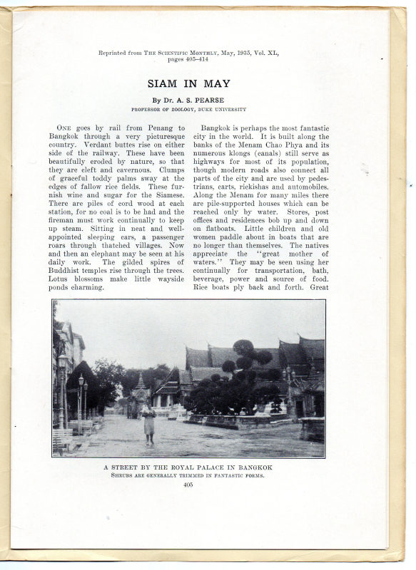 * Ein Stimmungsbild aus verschiedenen Landesteilen mit interessanten photographischen Abbildungen mit Schwerpunkt aus Markt und Landwirtschaft, von Bankok, an einem Klong, am Menam, Paknam, Koph Chang. "Dr. A. S. Pearse Professor of Zoology, Duke University" (Titel).