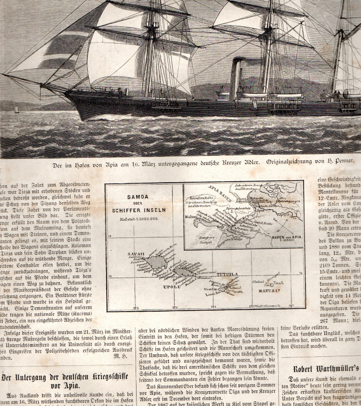 * Ansichten: "Die im Hafen von Apia (Samoa-Inseln) am 6. März gestrandete deutsche Kreuzercorvette Olga" (ganzseitig), "Der im Hafen von Apia am 16. März untergegangene deutsche Kreuzer Adler", "Das im Hafen von Apia am 16. März untergegangene deutsche Kanonenboot Eber", "Wrack des deutschen Kreuzers Adler", "Der Hafen von Apia nach der Katastrophe". - Schöne große Schiffsdarstellungen, bzw. die beiden dämonenhaften Fracks halbseitig. * (Ein Titel aus unserem Online-Angebot "Geographie - Australien, Ozeanien").
