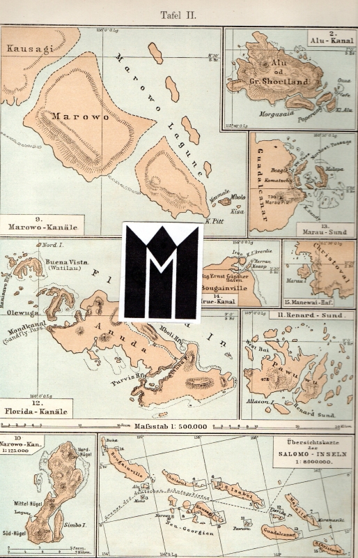 * Kanäle und Durchfahrten zwischen den Inseln, die auch auf den zwei Tafeln mit Landkarten dargestellt sind: König-Albert-Sund, Choiseul, Ortega-Sund, Isabel (Gallego-Kanal), Mono-Kanal, Maramaski-Kanal, Hathorn-Sund - Wanna Wanna-Kanäle -Blackett-Strasse, Marowo, Alu oder Gr. Short-Land, Marau, Irue (Bougainville), Manewai (Christoval), Florida-Kanäle (Anuda), LL.Renard-Sund (Pawuwu), Narowo und Übersichtskarte mit Grenze des deutschen Schutzgebietes.- Salomonen, Salomon Inseln bzw. Islands.