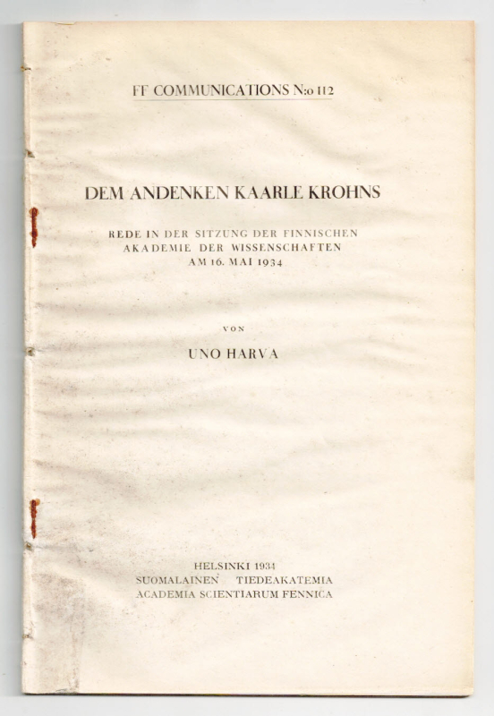 Helsinki, Suomalainen Tiedeakatemia, Academia Scientiarum Fennica 1934. 35 S. Gr.-8°. Orig.-Geheftet (Klammern rostig, Rand etwas angestaubt). (FF Communications, 112). - Durchgehend wellig.