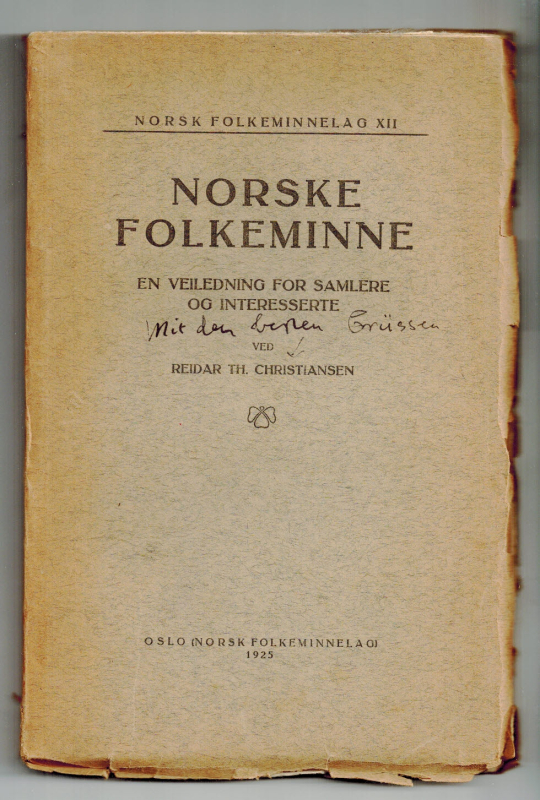 Oslo, Norsk Folkeminnelag 1925. 125 S. Gr.-8°. Orig.-Karton (Ränder gebräunt, mit Widmung des Autors). (Norsk Folkeminnelag, 12). - Unaufgeschnitten.