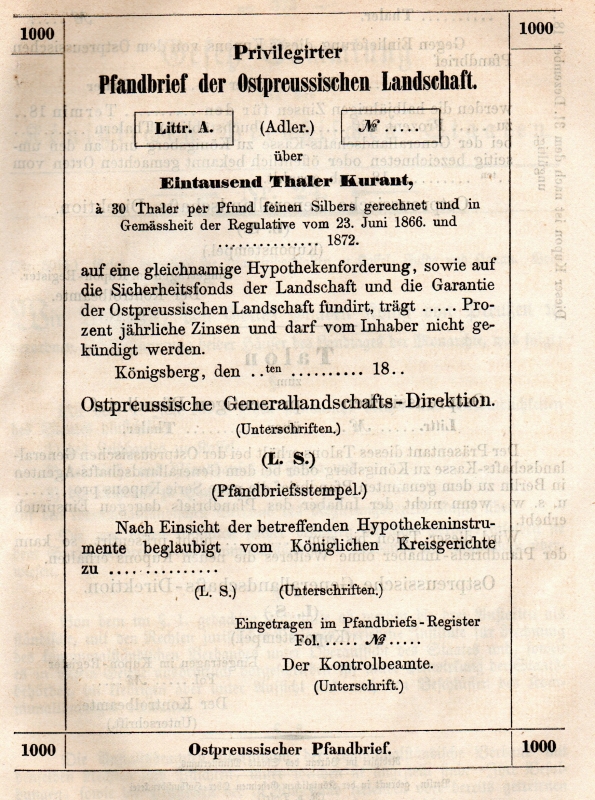 StartseiteBücherGeschichte Neuzeit (Preußen: Gesetze)Allerhöchster Erlaß vom 6. April 1872., betreffend die Genehmigung des nach dem Beschlusse des 30. Generallandtages der Ostpreußischen Landschaft entworfenen Regulativs wegen Konvertirung der fünfprozentigen Pfandbriefe und anderweiter Ausfertigung von 4 1/2 = resp. 4= und 3 1/2prozentigen Pfandbriefen der Ostpreußischen Landschaft.