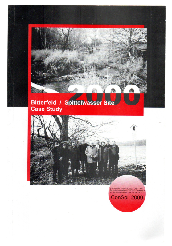 * "2000 Bitterfeld / Spittelwasser Site. Case Study" (Umschlagtitel). Kontaminierter Boden: Fallstudie. Vergleich von Lösungen für eine große Kontamination basierend auf verschiedenen nationalen Richtlinien. - Mulde, Niederungsgebiet Spittelwasser, Jeßnitz (Anhalt), ein Stadtteil von Raguhn-Jeßnitz, nördlich von Wolfen, verunreinigtes Grundwasser.