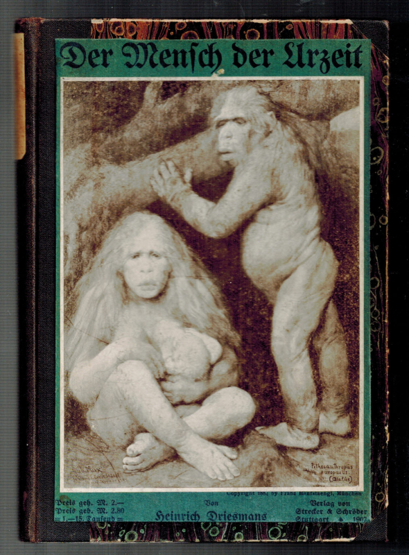 * Das Titelbild zeigt eine Familie des "Pithecanthropus alalus" [Java-Mensch] nach dem Gemälde von Gabriel Max, welches im Besitz von Ernst Häckel [Haeckel] in Jena war. Heinrich Driesmans unterzeichnet sein Vorwort zu Berlin-Wilmersdorf im Dezember 1906. * (Ein Titel aus unserem Online-Katalog "Geschichte - Ur- und Frühgeschichte").