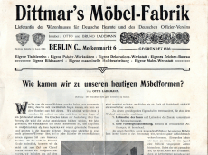 * Ein dekorativer Möbelprospekt der Kaiserzeit "für den Bedarf des grossen gebildeten Publikums" mit dem üblichen Mobilar zwischen Gründerzeit und Jugendstil. Textlicher Aufhänger ist der vorderseitige Beitrag von Otto Lademann: "Wie kamen wir zu unseren heutigen Möbelformen?". * (Ein Titel aus unserem Online-Katalog "Kunst - Kunstgewerbe, Möbel, Glasmalerei, Volkskunst").