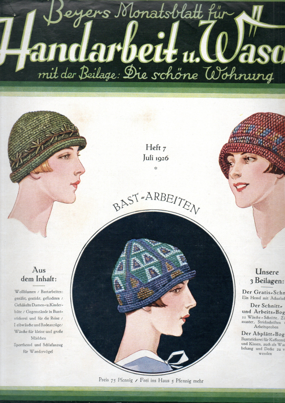 * Ein tolles Modemagazin bzw. Textilmagazin der Zwanziger Jahre. Schriftleitung: Bertha Schwetter und Marie Nieder. "Zierliche Wollblumen", "Die große Sommermode: Hüte aus Seiden- und Naturbast" (Bezug: Hedwig Axmann, Gautzsch bei Leipzig), "Ferienarbeiten aus buntem Bast" (dazu Photo Taschen von Hedwig Axmann), "Schöne moderne Buntstickereien (Bezug: Alice Kurek, Leipzig, dto. mit Adresse), "Festkleidchen für kleine Mädchen" (Werkstatt Freytag-Just, Dresden-A., mit Adr.), "Bade- und Strandanzug", Schürzchen für Mädchen, "Frühmorgens im Hause", sowie zum Thema Einrichtung "Der mechanisierte Baumeister" stellt das "DeWe-Plattenhaus" mit der dafür geeigneten Möbel (Deutsche Werkstätten Hellerau, 7 Abb.) vor (Bruno Paul, Karl Bertsch). - Rückseitig Reklame für Schwanen-Wollgarne (Wollarbeiten jeder Art). * (Ein Titel aus unserem Online-Katalog "Kunst - Mode, Textilien, Teppiche").