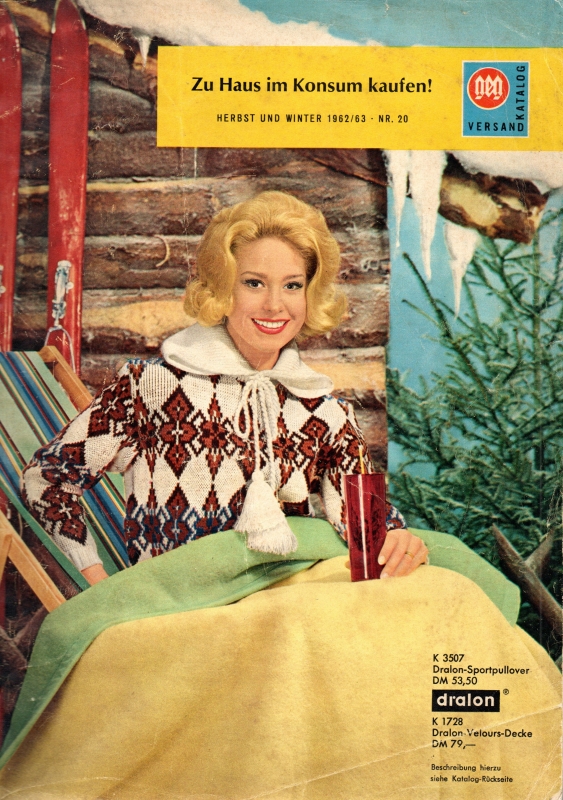 * Versandhauskatalog der Konsum Genossenschaft, die Ware konnte in der KONSUM-Verkaufsstelle versandkostenfrei abgeholt werden, lediglich die Möbel wurden angeliefert ("Im Konsum kaufen kluge Kunden"), aufgelistet sind dazu die Adressen von 35 Konsum-Möbelhäuser. Schwerpunkte in diesem Katalog: Mode und Textilien (bis S. 81), Ausstattung für den Haushalt, div. Hausrat, Werkzeug, Elektrogeräte, Spielzeug, Möbel. * (Ein Titel aus unserem Online-Katalog "Kunst - Mode, Textilien, Teppiche").