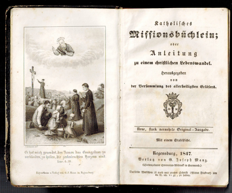 * Das Titelbild als Stahlstich von J. Dielmann zeigt die Begebenheit Luc 4,18 (Regensburg, Manz), das Volk und Geistliche vor dem Kreuz versammelt, aus dem Himmel schaut St. Alphonsus. Anonyme Vorrede unterzeichnet "Am Gnadenort Altötting". - Ein Dokument des katholischen Glaubens aus der Nähe von Schwäbisch Gmünd.