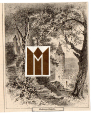Ansicht der Kirche und Staffel durch alte Bäume zu eine Pforte hochführend. Anonymer Holzstich.