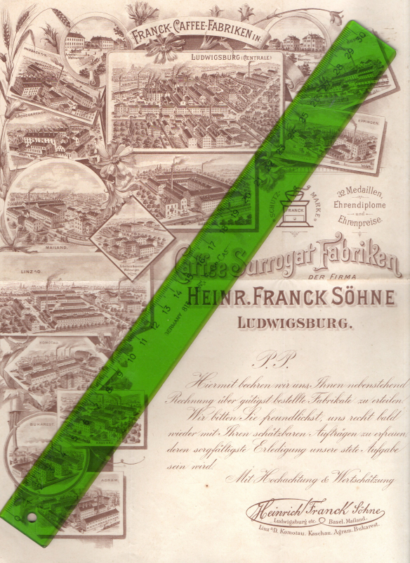 * Zu sehen sind die "Franck-Caffee-Fabriken" in Ludwigsburg (Centrale), Marbach a/N., Bretten, Eppingen, Großgartach, Mailand, Linz a/D., Komotau, Kaschau, Bukarest, Agram und Basel, sowie Arbeiterwohnungen und Beamtenwohnungen [in Ludwigsburg], Arbeiter- & Beamten-Wohnungen in Linz. Rückseitig ausgefüllt für einen Kaufladen (Joh. Armbruster) in Sersheim (bei Vaihingen an der Enz). Für Früchten Caffee und fest gebrannter Perlmalz. Quittiert durch den Vertreter Naumann. - Stichwort: Aecht Franck-Cafee, Kaffeeersatz, Malzkaffe.