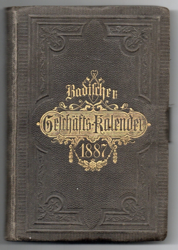 * Geschäftskalender für Baden: Mit sauberen regelmäßigen Eintragungen eines Bezirks-Ingenieurs in Bleisitft über seine Tätigkeiten und Gebühren als "Großh. Bezirksingenieur" (Wohnsitz und Dienstbezirk Überlingen bis 31. VII. 1887, dann Emmendingen). - Inspektion von Straßen, Wege, Brücken etc. Am ersten Dienstsitz um Überlingen am Bodensee, Meerdsburg, Pfullingen, Meßkrich u. a., sowie am zweiten Dienstsitz um Emmendingen, Waldkirch, Riegel, Elzach, Oberprechttal u. a. * (Ein Titel aus unserem Online-Katalog "Wirtschaft - Baden-Württemberg").