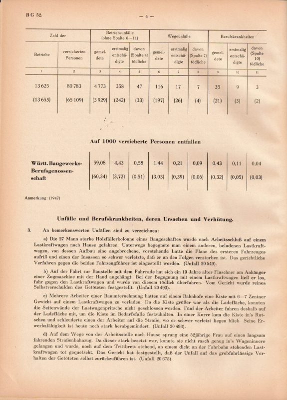 * Die erste Berichterstattung seit 1940. Wiederum unter dem Leiter Albert Hangleiter und Direktor [Ulrich] Prinzing, als technischer Berichterstatter ist 1949 Oberbauinspektor Witzig ausgewiesen. Interessant die ersten Seiten mit einer Darstellung zur Geschichte der BG in der Umbruchzeit zwischen Krieg und Provisorien der Nachkriegszeit (z. B. Ausweichstelle Beihingen am Neckar, Gasthaus zur Krone in der Kriegszeit, Anfänge in Stuttgart Wangen, der Neckarstraße, Landhausstraße und erneut der Neckarstraße), den Veränderungen im Versicherungswesen, aber auch im Bericht Nachrufe auf Erwin Stein, Julius Benz und Erich Thumm. Auch die zunehmenden Bautätigkeiten der Versicherungsnehmer zeugen vom Wiederaufbau. Vorangestellt ist als erstes Blatt ("Stuttgart, den 25. Januar 1949") ein Trauerblatt für "Direktor und Baumeister Emil Kübler" (Stuttgart), "Baumeister Emil Haller" (Bad Cannstatt), "Baumeister Josef Rapp" (Ulm) und Jakob Wuchter (Stuttgart-N) mit Ehrungstext. - Stichworte: Württembergische Bauberufsgenossenschaft, Unfallverhütung, Bauhandwerk, Bauindustrie, Hoch- und Tiefbau.