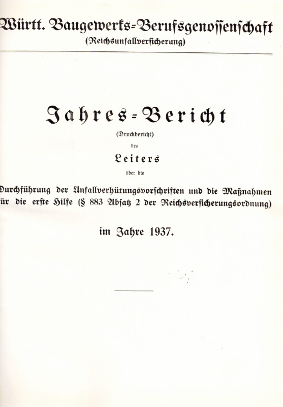 * Unter dem damaligen Leiter Albert Hangleiter und seinem Stellvertreter Emil Kübler (zuletzt Rudolf Brenner), wie auch Direktor [Ulrich] Prinzing. Genannt sind jeweils 5 Vertreter in den Gruppen Betriebsführer, Erste Stellvertreter, Zweite Stellvertreter, Versicherte, Erste Stellvertreter, Zweite Stellvertreter - mit Berufsangabe und Privatanschrift, sowie Ärzte, Prüfer usw. * Württembergische Baugewerkberufsgenossenschaft (Reichsunfallversicherung). Jeweils angebunden der "Jahres-Bericht des Leiters über die Durchführung der Unfallverhütungsvorschriften und die Maßnahmen für die erste Hilfe...". Im Bericht für 1937 sind zwei Abbbildungen mit Leitern der Firma von Wagner Schöpflin in Winterbach (Württ.), drei Abb. mit Kettenspanner der Firma Baustein-Industrie in Mühlacker, sowie zwei Abb. mit Gerüste der Firma Franz Hehle (Mühlacker) für Maler, Gipser und Fabrikhallen. - Stichworte: Württembergische Bauberufsgenossenschaft, Unfallverhütung, Bauhandwerk, Bauindustrie, Hoch- und Tiefbau.