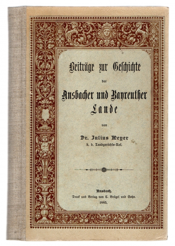 * Das Fürstentum Ansbach und Bayreuth wird beleuchtet mit Kapitel über Besuche, Begräbnisstätten, den Ansbacher Werwolf, Emigranten im Land, "Ansbacher Damen zu Ende des vorigen Jahrhunderts", Ansbach-Bayreuther Land und Feldmarschall Graf Neidhart von Gneisenau", "Ansbacher und Bayreuther Truppen in Amerika", der Name Ansbach, Freimaurertum in Ansbach und Bayreuth, "Ein Höflichkeits-Austausch der Cabinette von Ansbach und London" und über "Carl Alexander, der letzte Markgraf von Ansbach-Bayreuth, Demoiselle Clairon und Lady Elisa Craven". - Verfasst "...von Dr. Julius Meyer, k. b. Landgerichts-Rat" (Titel). [Vorbesitzer: Hippolyt von Vignau (1843-1926), Musiker, Theaterintendant des Großherzoglichen Hoftheaters in Weimar].