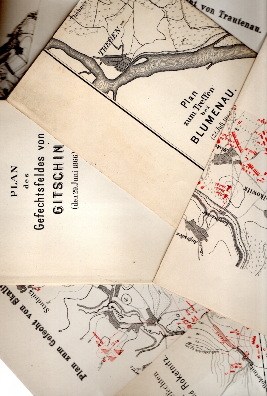 * Die gefalteten Karten und Pläne (Lithographien von C. L. Keller, Berlin) im hinteren Buchdeckel in Leinenkartentasche, mit Höhenausgleich zum Buchblock stabil angefertigt, für: "Plan zum Treffen bei Blumenau (22. Juli 1866)" [mit Preßburg 31,0 x 36,5 cm], "Plan des Gefechtsfeldes von Gitschin", "Plan zum Gefecht in Nachod", "Plan zum Gefecht v. Schweinschädel", "Plan zum Gefecht von Skalitz", "Plan zu den Gefechten von Tobitschau und Roketnitz", "Plan zum Gefecht von Soor" und "Plan zum Gefecht von Trautenau". - Vorwort datiert zu "Oldenburg (Großherzogtum), den 1. August 1899". - Stichwort: Deutscher Krieg. * (Ein Titel aus unserem Online-Angebot "Landeskunde - Böhmen, Mähren, Sudetenland").