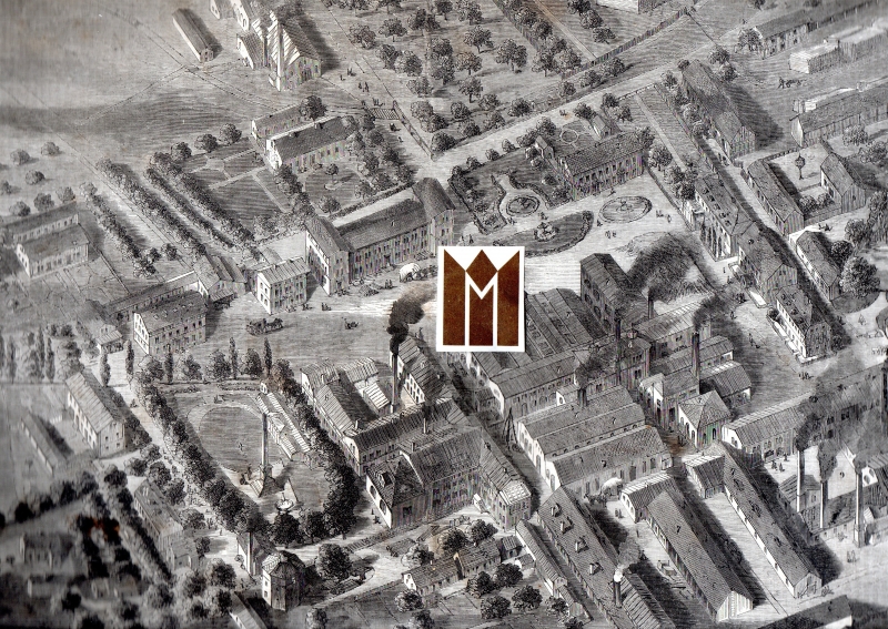 * Großformatige Ansicht aus der Vogelschau: "Das gräflich Einsiedel'sche Eisenwerk Lauchhammer", darunter Erklärungen: "1. Niederlage. 2. Comptoir. 3. Gasthof. 4. Obeliskenplatz. 5. Gasanstalt. 6. Montir- und Schlosserwerkstätten und Tischlerei. 7. Formereien. 8. Hohofen [Hochofen]. 9. Emailiranstalt. 10. Bronzegießerei und Ciseliranstalt. 11. Schule" (anonymer Holzstich, 23,3 x 34,7 cm). - Die berühmte Fabrik (Eisenhütte) für Eisenkunstguß und späteren Stätte der künstlerischen Plastiken von Lauchhammer.