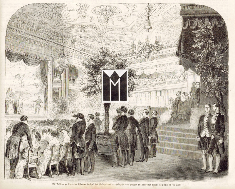 * Ansichten: "Die Feier der silbernen Hochzeit des Prinzen und der Prinzessin von Preußen: Die Beglückwünschung durch die Deputationen auf Schloß Babertsberg am 11. Juni" [Babelsberg], "Die Festfeier zu Ehren der silbernen Hochzeit des Prinzen und der Prinzessin von Preußen im Kroll'schen Locale zu Berlin am 12. Juni" und "Coblenzer Denkmünze zur silbernen Hochzeit des Prinzen und der Prinzessin von Preußen". - "Die Festlichkeit im Kroll'schen Locale bildete den eigentlichen Schlußstein des Ganzen..." (mit Nennung von Künstler unter Musikdirektor Engel, Darsteller und Beschreibung der Saalausschmückung). - Krolloper.