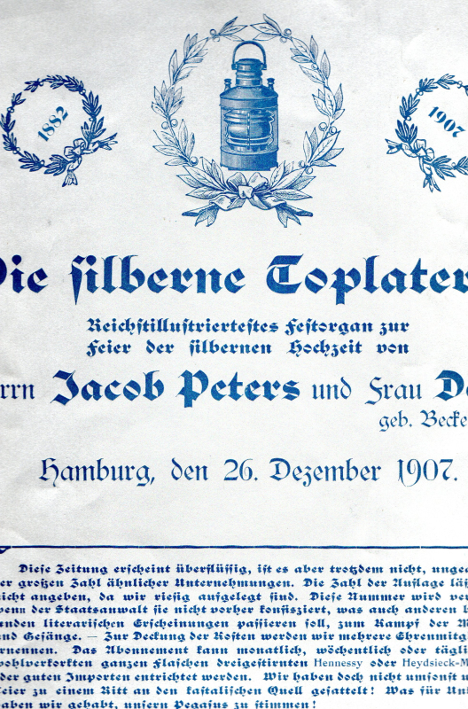 "Reichstillustriertestes Festorgan zur Feier der silbernen Hochzeit von Herrn Jacob Peters und Frau Dora geb. Beckedorf. Hamburg, den 26. Dezember 1907. 1. Ausgabe in diesem Jahrhundert. 1882 - 1907".