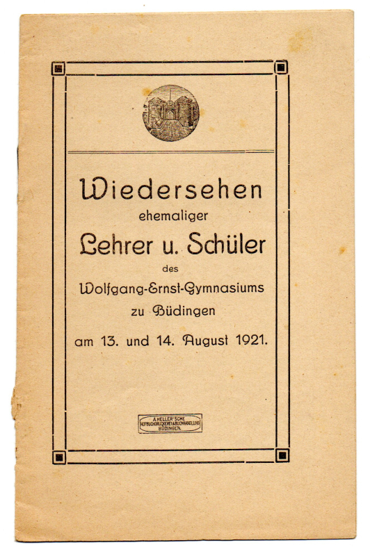 Wiedersehen ehemaliger Schüler u. Lehrer des Wolfgang-Ernst-Gymnasiums zu Büdingen am 13. und 14. August 1921.