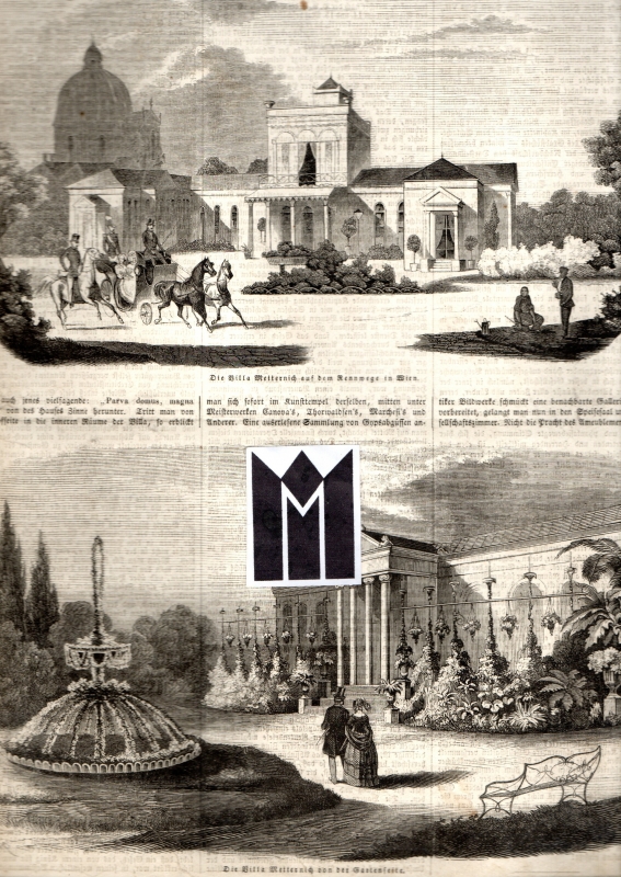 * Ansichten: "Die Villa Metternich auf dem Rennwege in Wien" und "Die Villa Metternich von der Gartenseite" (anonyme Orig.-Holzstiche, je ca. 14,5 x 22,5 cm), hübsche Darstellungen in runden Ecken, das Palais wohl in der ursprünglichen Form, davor Reiter, Fiaker, Gärtnerpaar. Die Parkseite mit einem flanierenden Paar seitlich des Springbrunnens, sowie Anpflanzungen gegen den Säuleneingang. - Stichworte: Palais Metternich, 1030 Wien Rennweg 27.