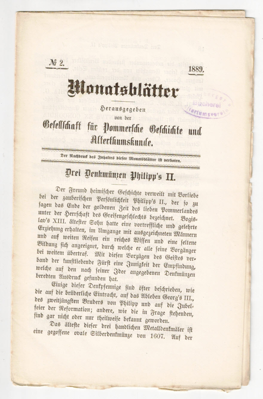 * "Drei Denkmünzen Philipp's II.". - Altertumskunde und Geschichte in Pommern. - (Ein Titel aus unserem Online-Angebot "Landeskunde - Pommern").