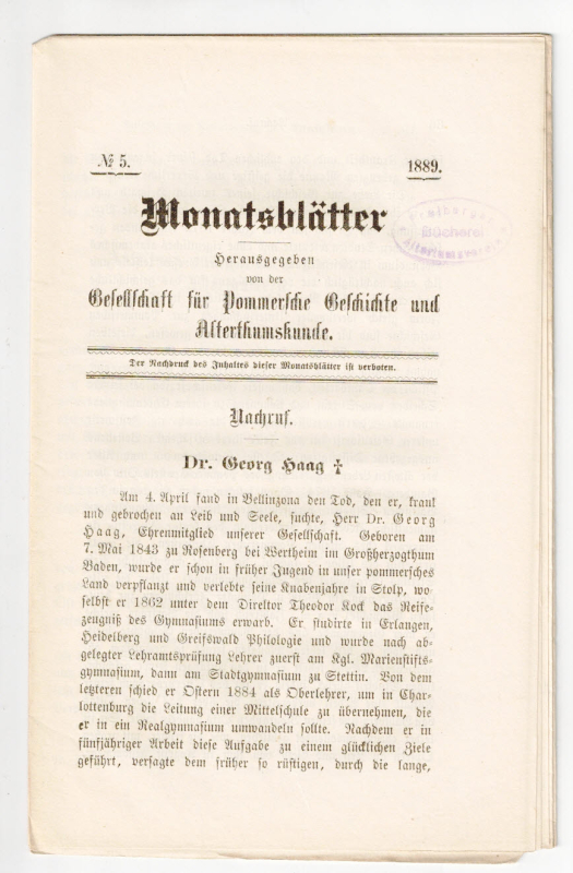 * "Nachruf" Dr. Georg Haag +" (geboren aus Rosenberg bei Wertheim am Main) u. a. - Altertumskunde und Geschichte in Pommern. - (Ein Titel aus unserem Online-Angebot "Landeskunde - Pommern").