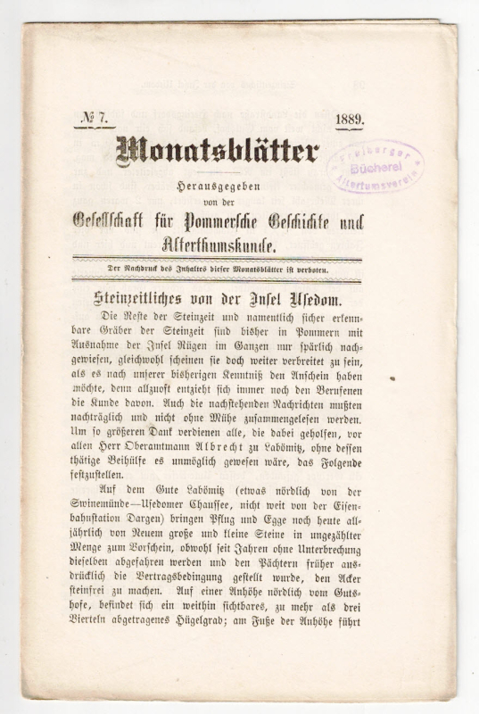 Monatsblätter. Hrsg. von der Gesellschaft für Pommersche Geschichte und Alterthumskunde.