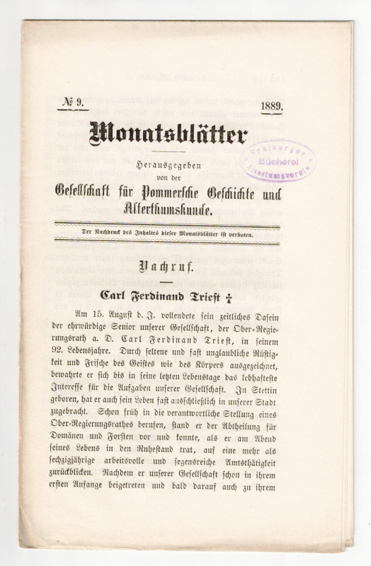 * "Nachruf. Carl Ferdinand Triest +", "Hügelgrab der römischen Zeit von Dranzig" Plato in Falkenburg, mit Zeichnungen auf Tafel). Altertumskunde und Geschichte in Pommern. - (Ein Titel aus unserem Online-Angebot "Landeskunde - Pommern").