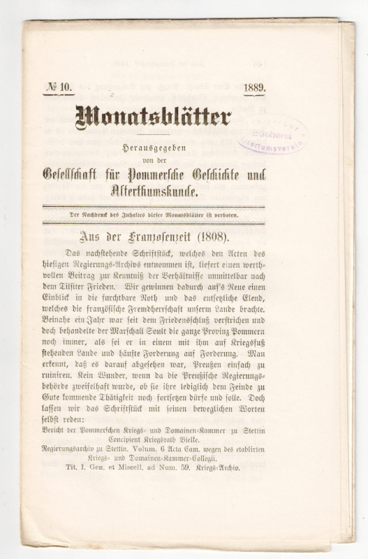* "Aus der Franzosenzeit (1808)". - Altertumskunde und Geschichte in Pommern. - (Ein Titel aus unserem Online-Angebot "Landeskunde - Pommern").