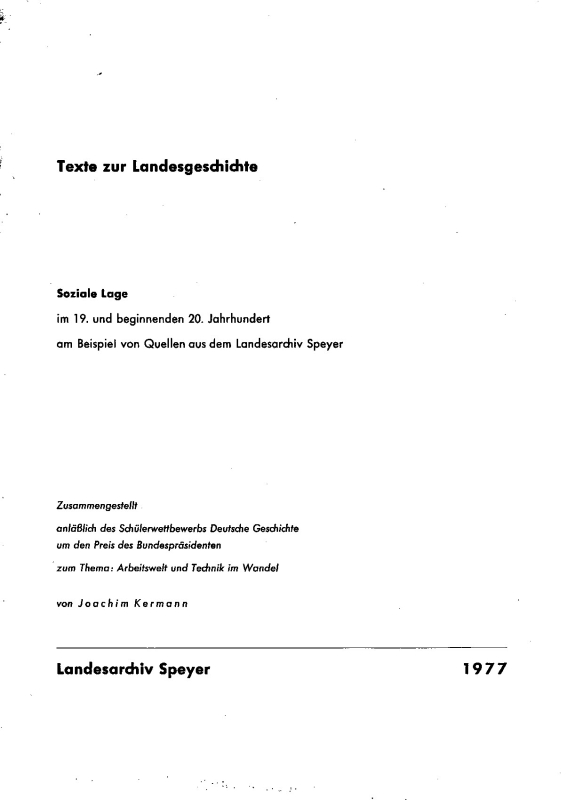 1977. Anläßlich des Schülerwettbewerbs Deutsche Geschichte um den Preis des Bundespräsidenten zum Thema: Arbeitswelt und Technik im Wandel. Zusammengestellt von Joachim Kermann. Sonderauflage: Den Teilnehmern des 38. Südwestdeutschen Archivtages in Neustadt an der Weinstraße vom 5. bis 7. Mai 1978. Mit faksimilierten Archivalien.