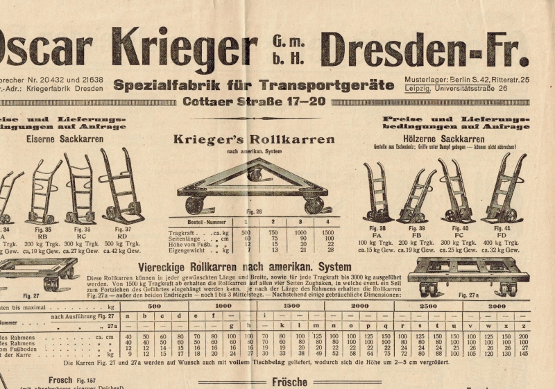 Oscar Krieger, G.m.b.H., Dresden-Fr., Cottaer Straße 17-20. Spezialfabrik für Transportgeräte.