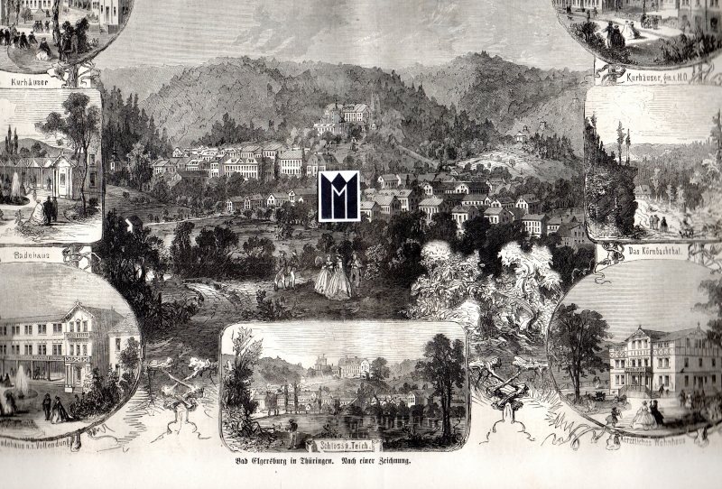 * Ansicht: "Bad Elgersburg in Thüringen", Textlegenden: "Kurhäuser. Kurgarten. Kurhäuser, ges. v. N.O. Badehaus. Das Körnbachthal. Badehaus n. s. Vollendung. Schloss u. Teich. Aerztliches Wohnhaus" (Holzstich, 23,2 x 33,9 cm).- Elgersburg war die erste Kaltwasserheilanstalt in Deutschland, lag damals zu Sachsen-Gotha gehörig im Amt Liebenstein bzw. Ohrdruf, dann im Kreis Arnstadt, später Ilmenau.