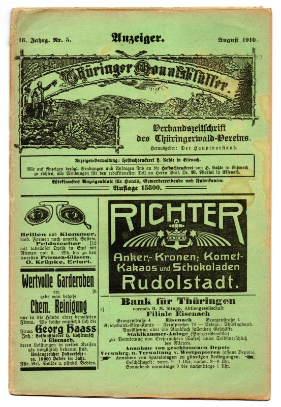 Verbands-Zeitschrift des Thüringerwald-Vereins. Hrsg. vom Hauptvorstand, Eisenach. Schriftleiter: W. Nicolai. 18. Jahrgang, August 1910, Nr. 5. Mit illustr. Kopfleiste (Wanderer) und 1 Abb.