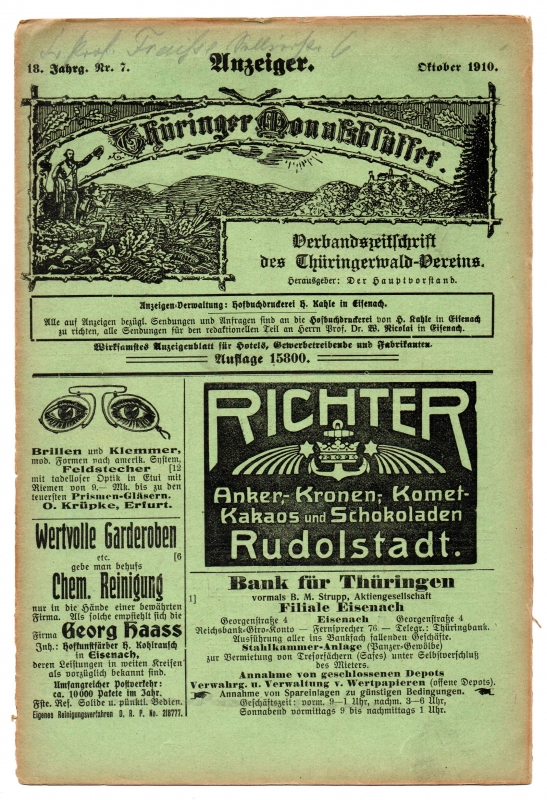 * Unter den Beiträgen: "Protokoll der 31. Generalversammlung" (Ziegenrück, 21. August 1910, dabei eine Liste mit 85 Namen von Bevollmächtigten der Zweigvereine, welche vor Ort waren), "Die Verkehrseinrichtungen vor Gründung der Postanstalten in Thüringen" [Teil] II (Hermann Herzer, Blankenburg) und "Wie wir in Hörschel übernachteten" (Rudolf Zwetz aus Jena auf Rennsteig Wanderung). - Unter den Anzeigen solche wie z. B. für das "Blankenhain er Malz-Kraft-Bier", das "Pfarrer Hofmann's Reform-Institut Unterneubrunn i. Thür" [heute Schleusegrund] u. v. a. - Thüringerwaldverein. - (Ein Artikel aus unserem Online-Katalog "Landeskunde - Thüringen").