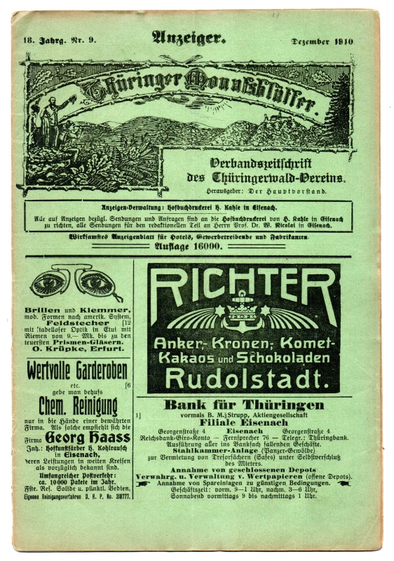 Verbands-Zeitschrift des Thüringerwald-Vereins. Hrsg. vom Hauptvorstand, Eisenach. Schriftleiter: W. Nicolai. 18. Jahrgang, Dezember 1910, Nr. 9. Mit illustr. Kopfleiste (Wanderer).