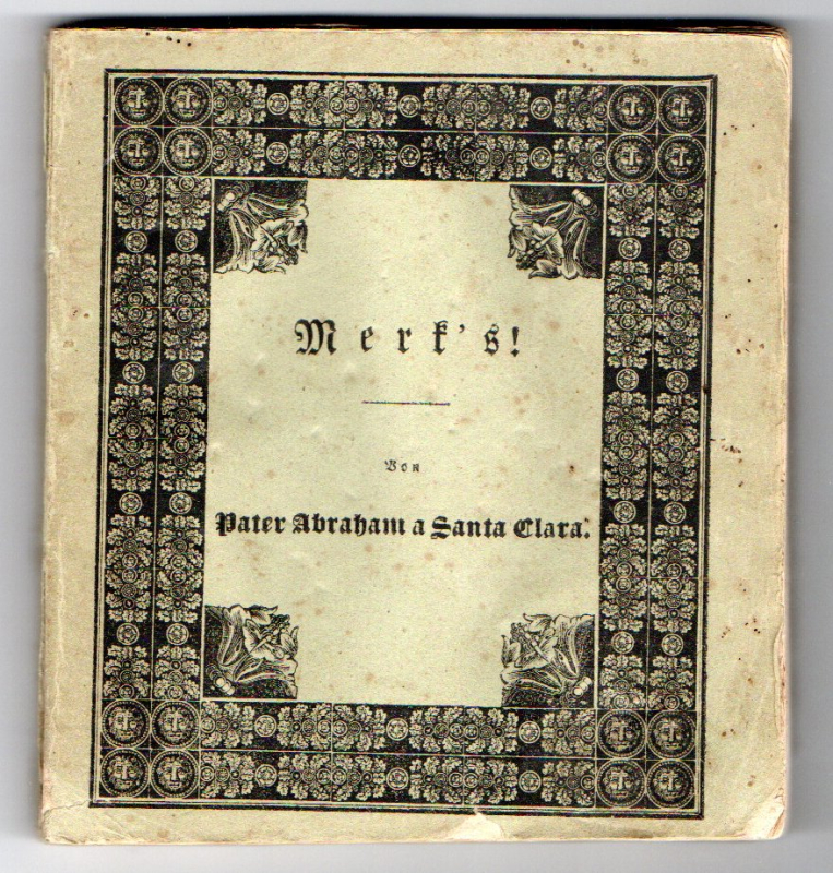 * Das Titelbild zeigt den vollbärtigen Abraham a Sancta Clara beim Lesen mit hochgehaltenem Druckwerk in beiden Händen. Herausgeber war Heinrich Dittmar (1792-1866), der in seiner Vorrede auch über den Autor berichtet "... Er heißt eigentlich Ulrich Megerle, und ist gebohren am 4. Junius 1642 zu Krähenheimstetten, unweit Möskirch, in Schwaben". Buchabschnitte: Einleitungs-Merk's, Mensch, geistlicher Herr, gelehrter Herr, Soldat, Jungfe, Eheleut', reicher Mann, Welt, Schluß-Merk's. - Kreenheinstetten, Leibertingen, Meßkirch.