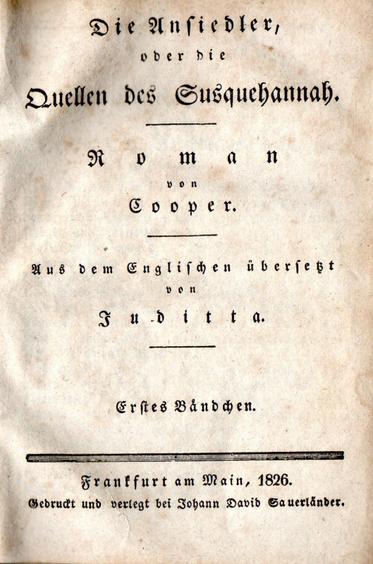 Uebersetzt von Mehreren und hrsg. von Christian August Fischer. Dreizehntes [13.] bis Achtzehntes [18.] Bändchen. Die Ansiedler. Erstes [1.] bis Sechstes [6.] Bändchen [komplett]. Die Ansiedler, oder die Quellen des Susquehannah. Roman. Aus dem Englischen übersetzt von Juditta. In einem Band gebunden.