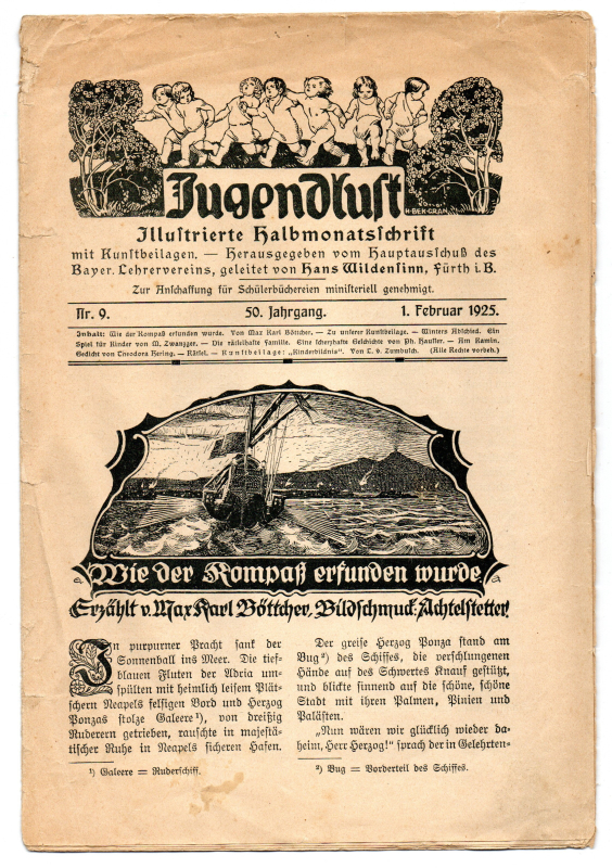 Nürnberg, Jugendlustverwaltung 1925. S. (129)-142. 4°. Orig.-Geheftet (vorderseitige Illustration: "Galeere vor Neapel", momogrammiert "G. A."). - Deutliche Gebrauchsspuren, am Ende fehlt das letzte Blatt, ohne Kunstbeilage.