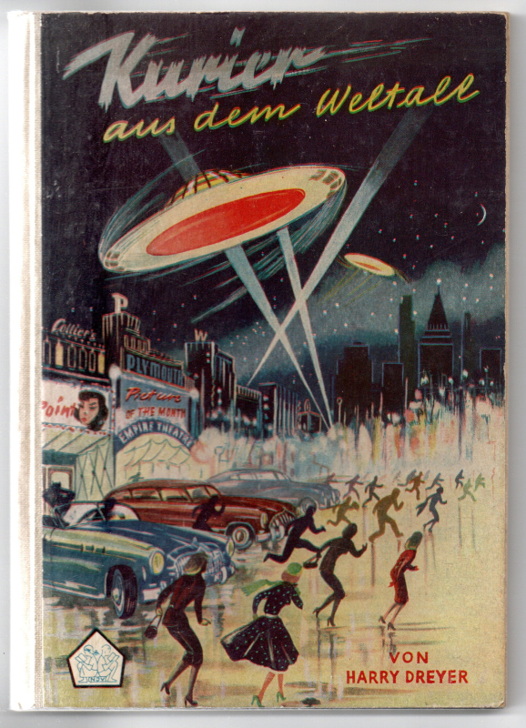 Hannover, Neuer Jugendschriften-Verlag 1955. 62 S. Farbig illustr. Orig.-Halbleinen (von Walter Kellermann, flüchtende Personen auf Großstadtstraße, darüber fliegende Untertassen). - Sehr guter Zustand, lediglich Widmung auf Titelblatt.