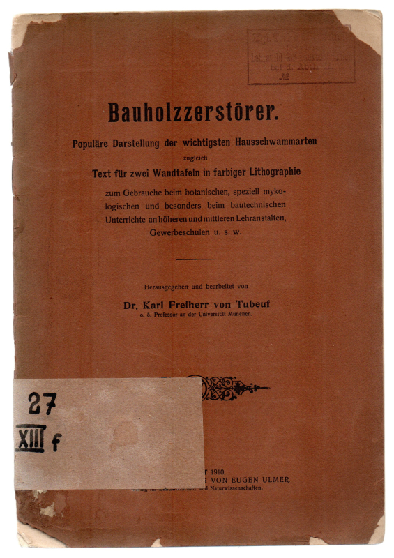 * Die hier nicht vorhandenen großformatigen Wandtafeln zu diesem Erläuterungsheft, gemalt von Adalbert Eckert, sind betitelt: "Der echte Hausschwamm, Merculius lacrymans" und "Der weiße Porenhausschwamm, Polyporus vaporarius und Verwande", jedoch als Textabbildungen wiedergegeben. Heute Serpula lacrymans (Echter Hausschwamm) bzw. Polyporus vaporarius. - Karl Freiherr von Tubeuf war "Professor an der Universität München" (Amorbach 1862 - München 1941).