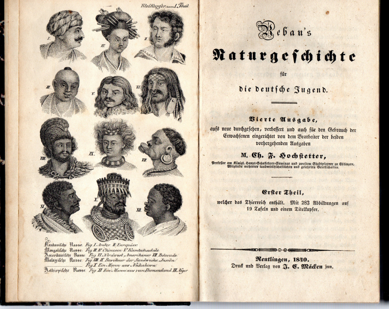 * Enthält im ersten Band das Tierreich [Zoologie] und im zweiten Band das Pflanzenreich und Mineralreich [Botanik und Mineralogie]. 19 Tafeln zeigen Tiere wie Affen, Fledermäuse, Pferde, Säugetiere, Vögel (4), Amphibien oder Lurche, Käfer und Geradflügler, u. a.; zu den Pflanzen finden sich 11 Tafeln aus Wald, Feld, mit Gräser (2), Farn, Moose und Flechten, Giftpflanzen (4, auch mit Pilze). Am Ende des ersten Teils Erklärung der Tafel mit den "5 Menschenrassen" (Kaukasische, Mongolishce, Amerikanische, Malayische, Aethiopische). - "Ch. F. Hochstetter" war zum Zeitpunkt des Erscheinens dieser vierten Ausgabe "Professor am Königl. Haupt-Schullehrer-Seminar und zweiter Stadtpfarrer in Eßlingen, Mitgliede mehrerer landwirthschaftlichen und gelehrten Gesellschaften". Vorangestellt sind auch seine Vorworte zur zweiten Ausgabe ("Eßlingen, den 29. Juni 1828" zum ersten Teil und "Eßlingen, den 5. Dezember 1828" zum zweiten Teil), wie auch zur dritten Ausgabe ("Eßlingen, den 12. August 1833"). Hatte er schon Rebaus ausschweifende Darstellung tropischer Tiere gekürzt ausdrücklich zugunsten der heimischen Amphibien, so erhielt die vorliegende Bearbeitung insbesondere durch vermehrte Darstellung der Insekten erfreulichen Gewinn. In zwei abschließenden Absätzen am Ende des Werkes ruft er sodann in einem die Jugend zu Betrachtung und Erforschung in der Natur auf, während er im anderen Eltern und Erzieher ermuntert, als Teil der Erziehung für das Leben "die Jugend Käfer und Schmetterlinge, lasset die Pflanzen und Mineralien sammeln" mit entsprechenden Begründungen. * (Ein Titel aus unserem Online-Angebot "Naturwissenschaften - Botanik").