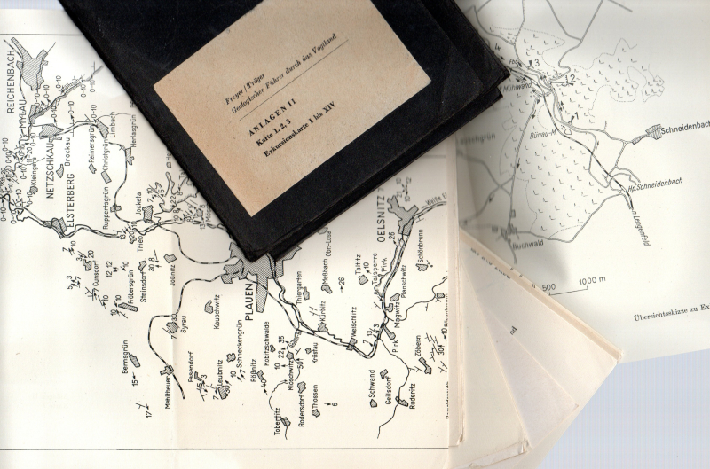 * Karte 1 (Weiße Elster von Oelsnitz über Plauen, Elsterberg, bis Greiz, Mylau, Reichenbach), Karte 2 (farbige große geologische Karte Großraum Plauen samt östl. Vogtland von südlich Schönberg Bad Brambach über Muldenberg bis Reichenberg), Karte 3 (kleine Skizze mit Gewässernetz), sowie die Exkursionskarten (Plauen Süd, Plauen bis Syrau, Straßberg und Kürbitz, Möschwitz bis Jocketa und Weichlitz nach Pirk, Talsperre Pirk mit Taltitz nach Oelsnitz, Dasselbe mit Magwitz Planschwitz Schönbrunn und Lauterbach, Oelsnitz bis Lottengrün und Theuma, Syrau über Fröbersgrün Taubertsmühle bis Elsterberg, Elsterberg bis Netschkau Mylau, Limbach über Mühlwand bis Rotschau, Talsperre Muldenberg über Hammerbrücke oder Schneckenstein bis Tannenbergsthal, Bad Elster über Sohl nach Markneukirchen, Raun über Oberbrambach, Bad Brambach, Bärendorf nach Schönberg). Ergänzend eine unbezeichnete Karte zu einem Text des Buches (Sattel von Plauen-Möschwitz, Querelemente Tauschwitz u. a.). * (Ein Titel aus unserem Online-Katalog "Naturwissenschaften - Geologie, Mineralogie").