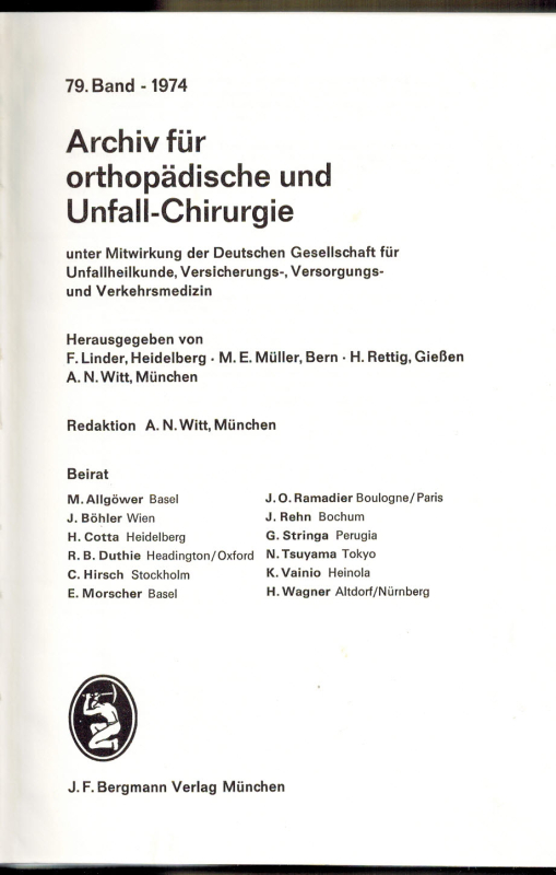 * Eine beeindruckende Sammlung wissenschaftlicher Abhandlungen, z. B. (79. Band) "Herausgegeben von F. Linder, Heidelberg. M. E. Müller, Bern. H. Rettig, Gießen. A. N. Witt, München. Redaktion A. N. Witt, München. Beirat: M. Allgöwer, Basel. J. Böhler, Wien. H. Cotta, Heidelberg. R. B. Duthie, Headington/Oxford. C. Hirsch, Stockholm. E. Morscher, Basel. J. O. Ramadier, Boulogne/Paris. J. Rehn, Bochum. G. Strings, Perugia. N. Tsuyama, Tokyo. K. Vainio, Heinola. H. Wagner, Altdorf/Nürnberg.