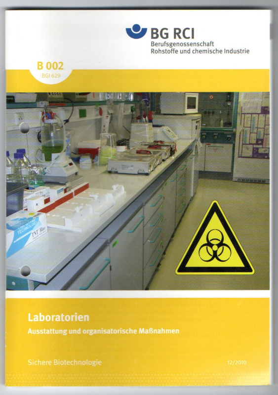 * BG RCI B 002. Gefährdungsbeurteilung, Laboratoriumseinrichtung- und ausstattung, Persönliche Schutzausrüstung, Schutzmaßnahmen, Hygiene, Sterilisation, Desinfektion, Dekontamination, Transport, Gefahrstoffe im biotechnischen Laboratorium, Brandschutz, Maßnahmen in Notfällen und bei Störungen, Arbeitsmedizinische Prävention, Beschäftigungsbeschränkungen, Qualifikationsanforderungen an Verantwortliche und Beschäftigte usw., sowie ein Anhang mit Muster und Pläne, sowie ein sehr hilfreiches Literaturverzeichnis. * ISBN 978-3-86825-002-02 * Reihe: