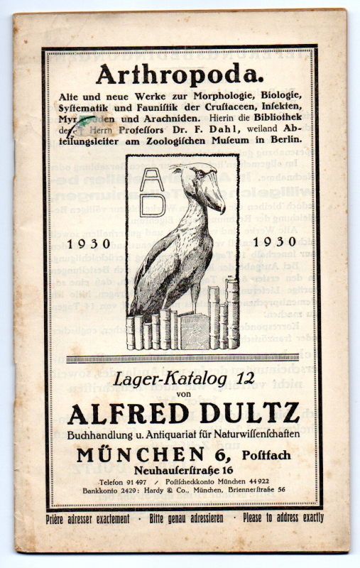 * Gliederfüßer (Antropoda) * Antiquariatskatalog der Büchersammlung von Friedrich Dahl, enthält auch Crustacea, Insecta, Coleoptera, Lepidoptera, Diptera, Hymenoptera u. a. - Friedrich Dahl 1856 Rosenhofer Brök zu Rosenfelde, heute Ortsteil der Gemeinde Grube, Schleswig-Holstein - Greifswald 1929, Kustos am Zoologischen Museum Berlin. * (Ein Titel aus unserem Online-Katalog "Naturwissenschaften - Zoologie: Entomologie").