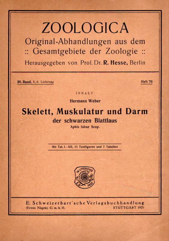 * Über die Schwarze Bohnenlaus (Aphis fabae) von "Hermann Weber, Bonn" (Titel). Mitteilung aus dem Institut für Pflanzenkrankheiten der Landwirtschaftlichen Hochschule Bonn-Poppelsdorf. Direktor Prof. Dr. E. Schaffnit. - Der in Bretten 1899 geborene Entomologe Hermann Weber war von 1928-1930 Privatdozent in Bonn, später Präsident der Deutschen Zoologischen Gesellschaft, von 1951 bis 1956 ordentlicher Professor und Direktor des Zoologischen Instituts der Universität Tübingen. * (Ein Titel aus unserem Online-Angebot "Naturwissenschaften - Zoologie: Entomologie").