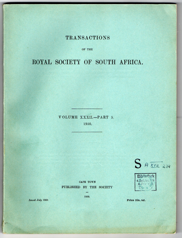 Cape Town, The Society 1950. S. 435-629, 3 Bl. Gr.-8°. Orig.-Karton (gestempelt). (Transactions of the Royal Society of South Africa. Vol. 32, 5). - Innen sehr guter Zustand.