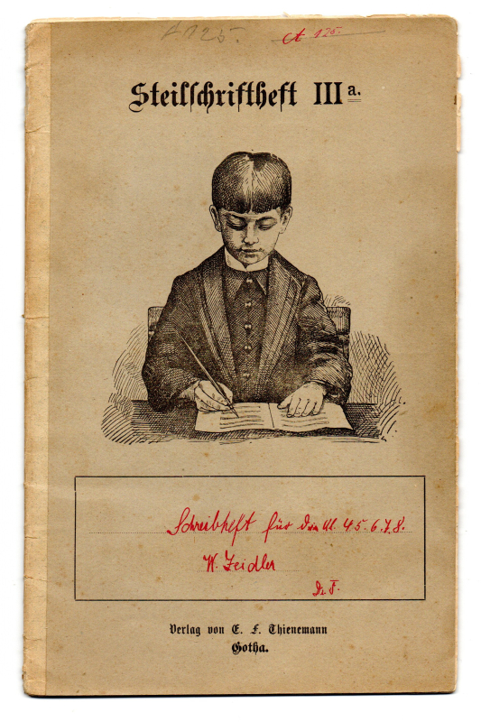 * Für den Schüler Willy Zeidler in Bad Lauterberg im Harz. Bezeichnet vom Lehrer oder Schulleiter Dr. F. "für die Kl. 4.5.6.7.8.". Enthält vollständig verwendet in deutscher Schreibschrift Übungen in Schönschrift. - Auf der Umschlagrückseite gedruckt die "Regeln für Steilschrift" in 8 Punkten, gedruckt unterzeichnet von "Dr. med. Paul Schubert-Nürnberg".